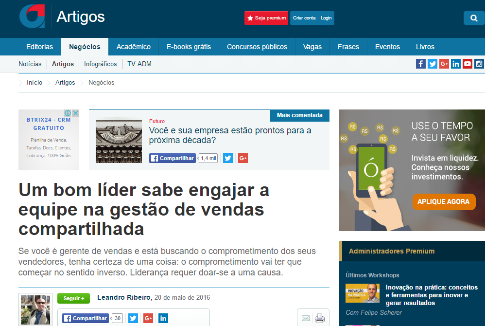 O artigo “Um bom líder sabe engajar a equipe na gestão de vendas compartilhada”, publicado pelo diretor comercial da SMark, Leandro Ceccato, fala sobre a importância da equipe comercial ser atuante e participar do planejamento estratégico de vendas em uma empresa. Com essa publicação, portanto, iniciamos uma parceria com o Administradores.com. Afinal, nada melhor que unir o “know-how” de uma empresa com 18 anos de experiência em gestão comercial com o alcance do maior canal online voltado à área de Administração e negócios da América Latina.